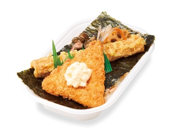 こだわりののりの上にアジフライ、ちくわ磯辺などがのった「アジフライのりタル弁当」。おてごろ価格でお買い求めいただけます。