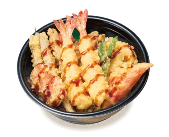 海老2尾にれんこん、かに風味かまぼこ、ごぼう3本、いんげん、皮なしソーセージ、ちくわ磯辺の7種が入ったボリューム満点の天丼です。